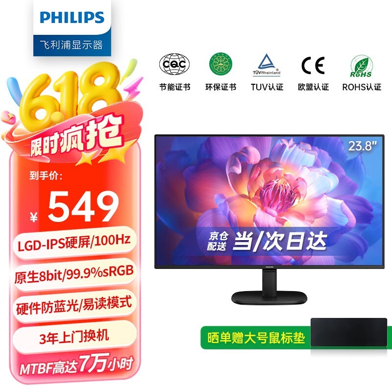 飞利浦 24B2N2100 23.8英寸 FHD 办公显示器 100Hz高刷 LGD-IPS 硬件防蓝光 护眼 HDMI+VGA 电脑显示屏