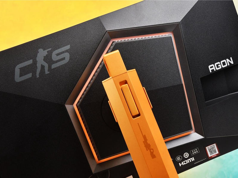 显示器底部印刻有AGON爱攻的品牌logo,加深用户品牌观念的同时,也一定程度上提升了产品辨识度。底座方面从正面看过去有两处CS定制设计,一个是托盘的CS徽标,另一个则是在支架上印刷的C4炸弹模型,其中徽标这块接下来在后面会频繁出现,就不过多赘述;而在支架上的C4模型则明显是对CS游戏模式的一种致敬,作为一位CS玩家,笔者认为这里在设计上的小巧思还蛮有意思的,就是能把经典的C4密码“7355608”也融合进去就更好了。