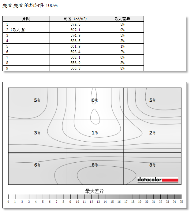 亮度均匀性的测试中,AGON CS24A显示器整体表现更加不错,亮度最大为第2象限,最大差异在第8象限,差值为50.2cd/m²。