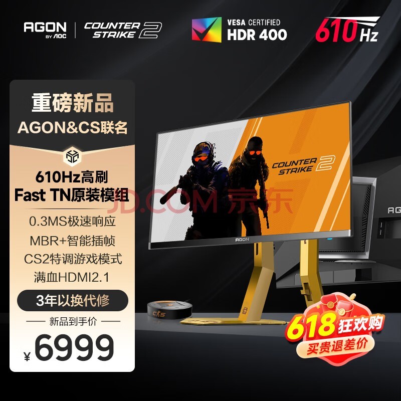 AOC 24.1英寸原生600Hz显示器专业FPS电竞CSGO屏幕Fast TN原装模组0.3MS响应 HDR400暗场控制 610HZ AGON CS24A