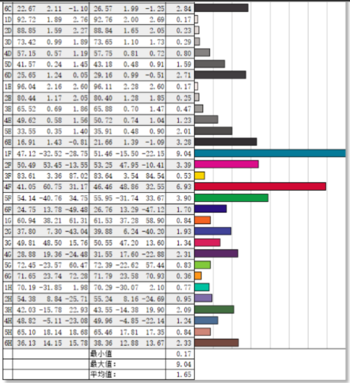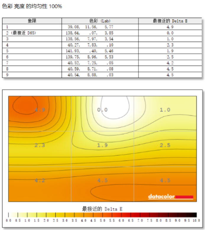 在色彩均匀性的测试中,飞利浦 16B1P3320便携显示器的第2象限最接近D65的标准,显示器左边第1象限与标准色温差值最大,不过也只有4.9,整体色彩均匀度表现尚可。