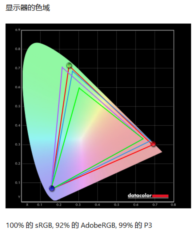 首先是色域测试,根据Spyder X Elite软件的测试结果显示,AGON AG276UZD显示器sRGB色域的覆盖度为100%,Adobe RGB色域的覆盖度为92%,P3色域的覆盖度为99%,表现完全符合官方宣传水平。