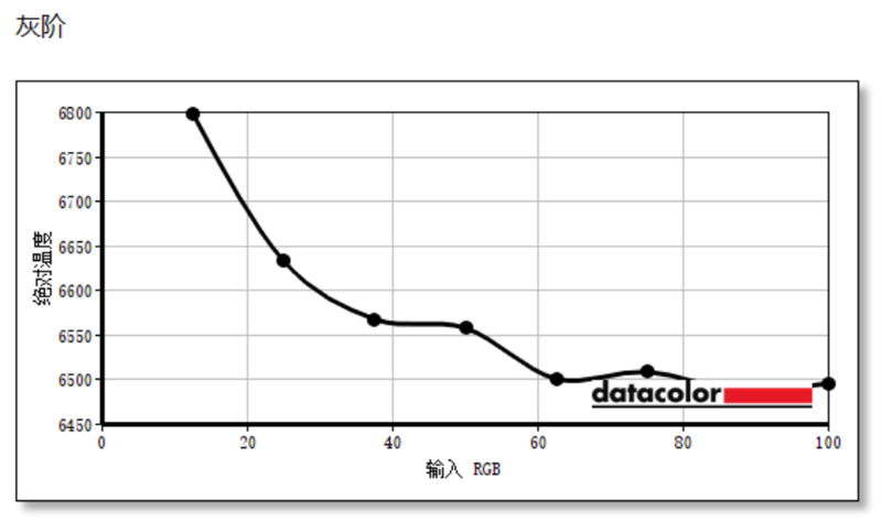 灰阶方面,显示器在全亮度下表现比较稳定,整体色温维持在6450~6800K之间,十分贴近标准色温。