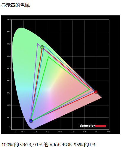 首先是色域测试,根据SpyderXElite软件的测试结果显示,HKC G25H1显示器sRGB色域的覆盖度为100%,AdobeRGB色域的覆盖度为91%,P3色域的覆盖度为95%,表现完全符合官方宣传水平。