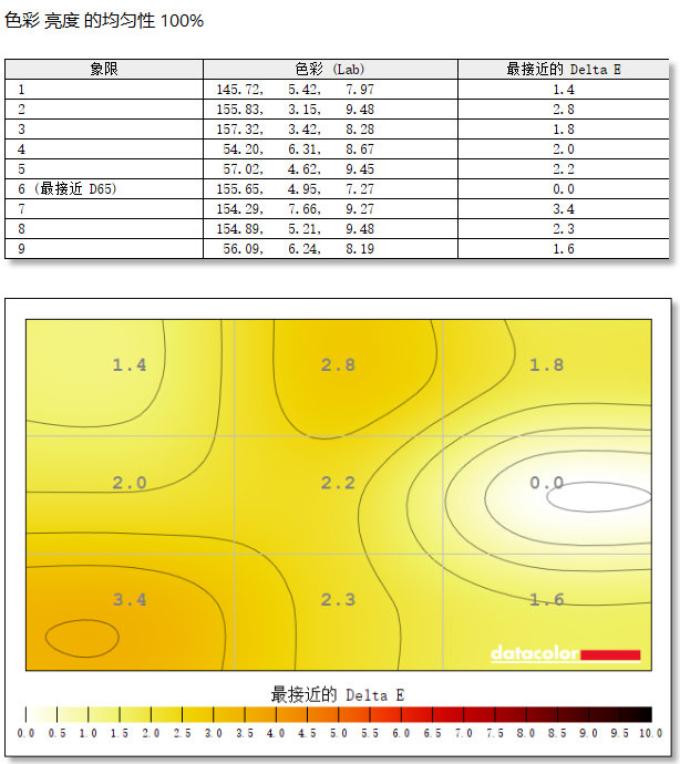 在色彩均匀性的测试中,HKC G25H1显示器的第6象限最接近D65的标准,显示器左边第7象限与标准色温差值最大,不过也只有3.4,整体色彩均匀度表现优秀。