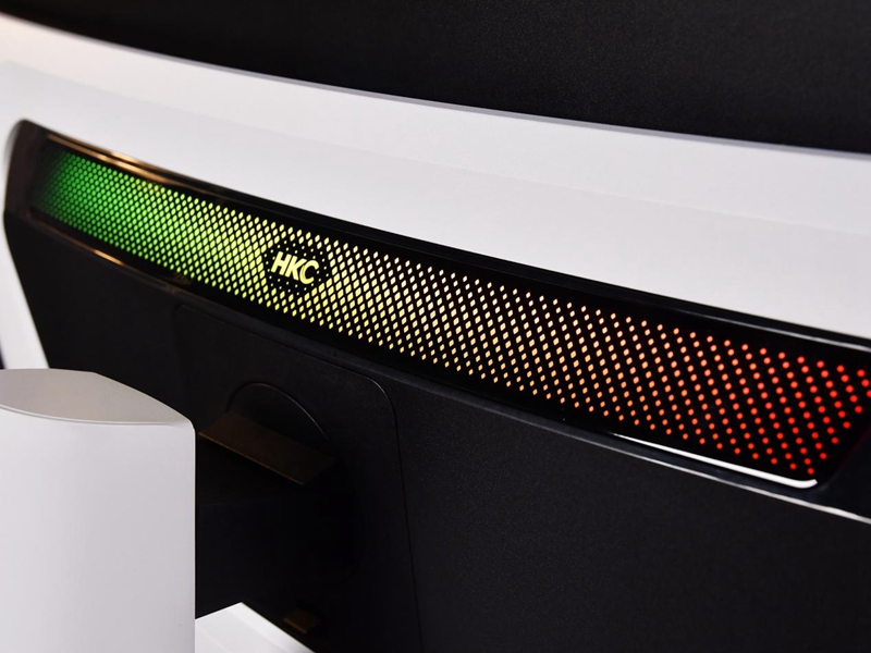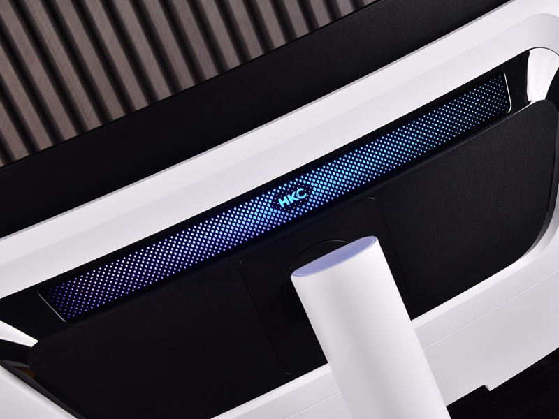 4、科技外观搭配时尚熊猫色,超薄机身联动炫彩氛围灯;HKC GS49UK的外观设计参考了非常丰富的科技元素,整体采用白加黑的配色设计,背部logo部分则通过RGB氛围灯点缀,整个的设计凸显了HKC在旗舰显示器方面出色的设计实力。