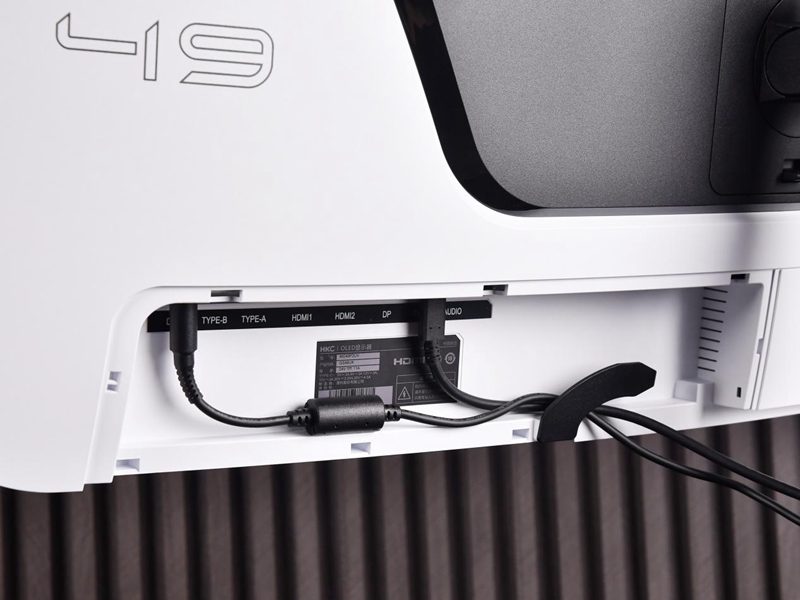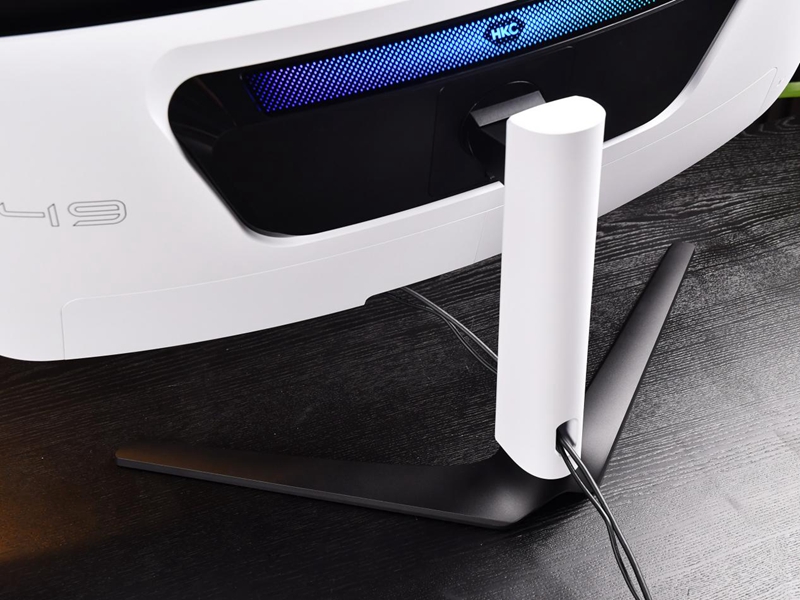 支架部位留有束线孔,方便用户使用时能够收纳线材保持桌面清洁。并且这次为了保证接口功能性的同时保证显示器整体外观的一致性,HKC GS49UK在接口处还附带了一个卡扣挡板,在安装好所有线材之后可以合拢挡板,喜欢收纳的用户一眼狂喜。