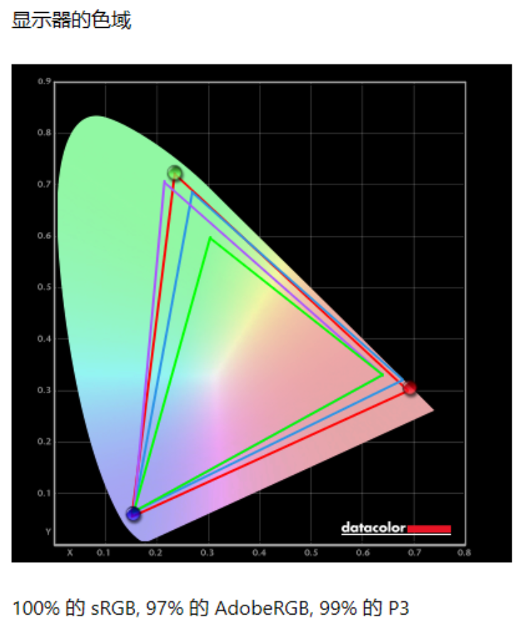 首先是色域测试,根据SpyderXElite软件的测试结果显示,HKC GS49UK显示器sRGB色域的覆盖度为100%,AdobeRGB色域的覆盖度为97%,P3色域的覆盖度为99%,表现完全符合官方宣传水平。