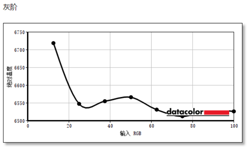 灰阶方面,显示器在20%-100%的亮度下表现比较稳定,整体色温维持在6550K左右,基本符合6500K标准色温。