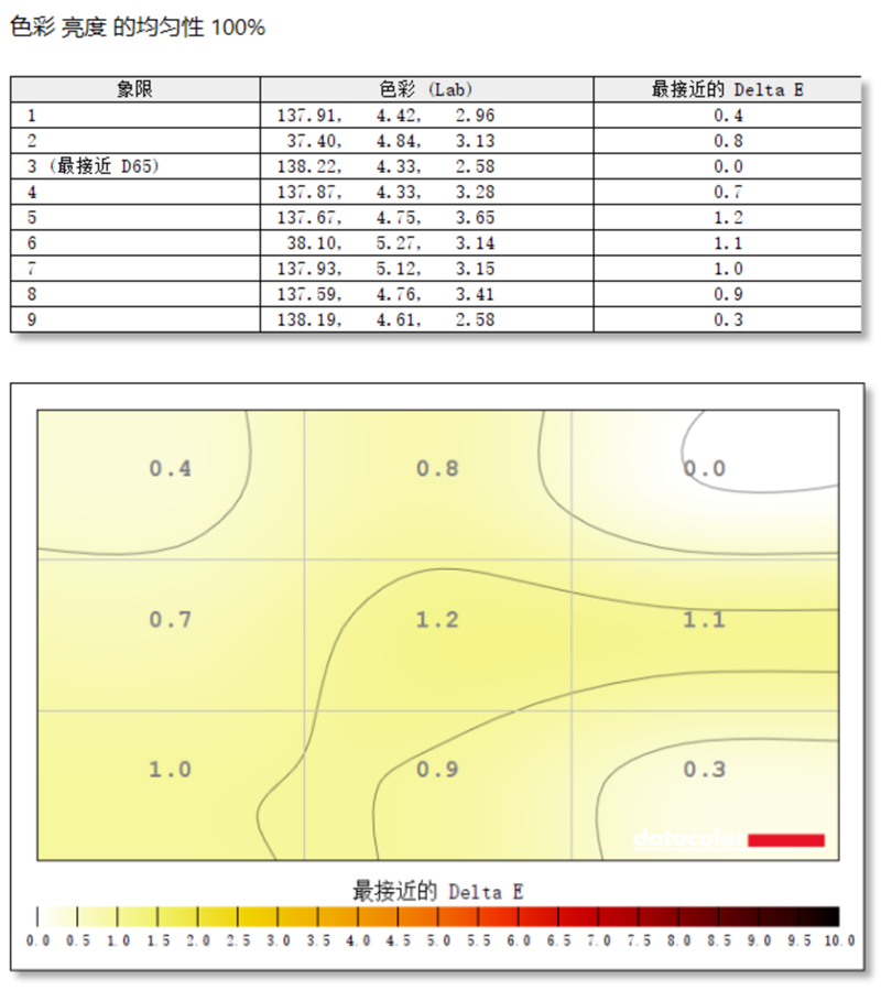 在色彩均匀性的测试中,HKC GS49UK显示器的第3象限最接近D65的标准,显示器中间第5象限与标准色温差值最大,不过也只有1.2,整体色彩均匀度表现十分优秀。