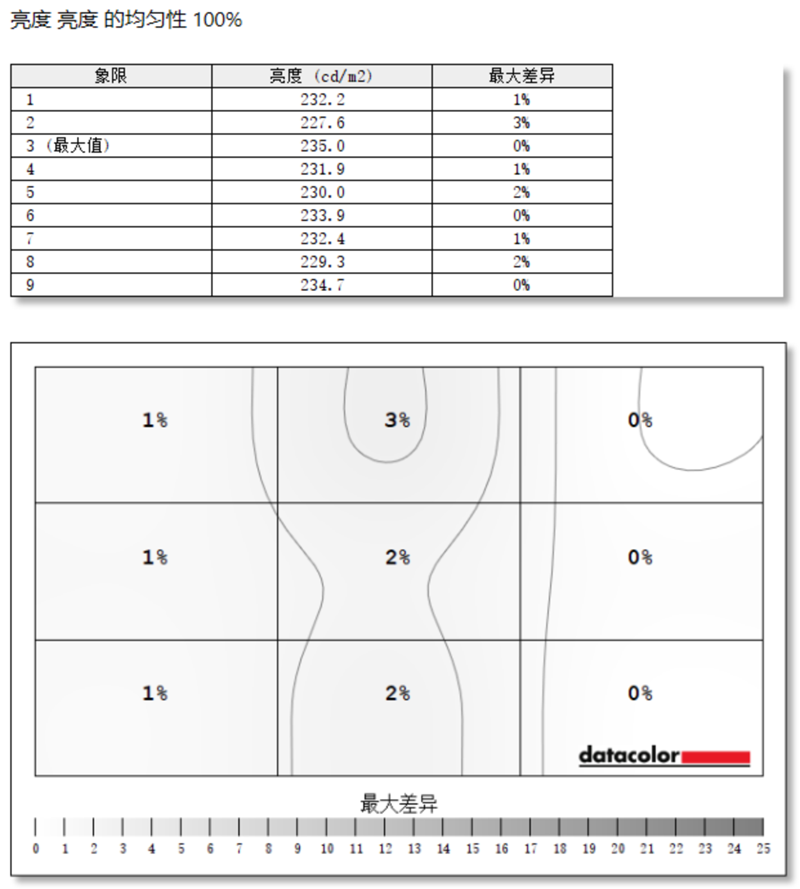 亮度均匀性的测试中,HKC GS49UK显示器整体表现也很优秀,亮度最大为第3象限,最大差异在第2象限,差值为7.4cd/m?。