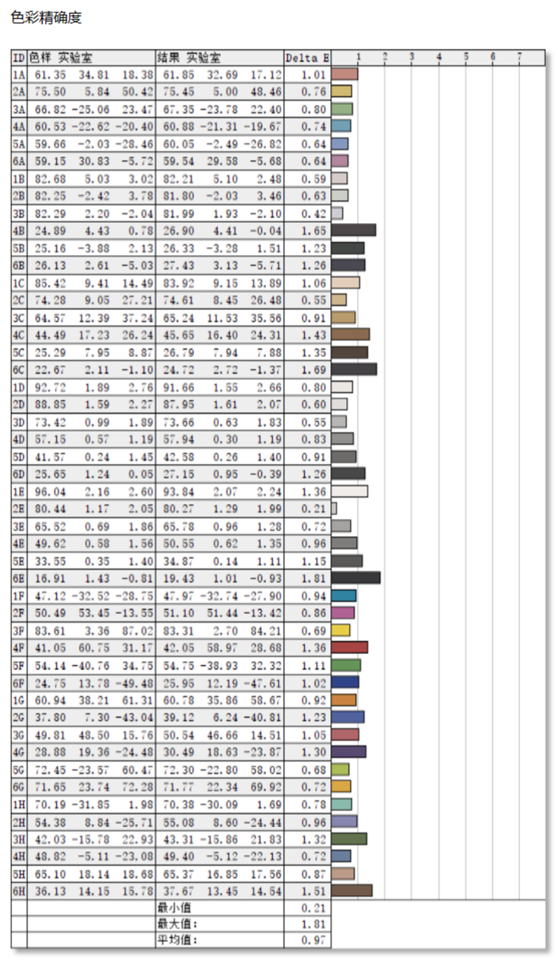 在色彩准确度的测试中,HKC GS49UK显示器结果为平均ΔE值为0.97,最大ΔE为1.81。一般来说平均ΔE<2,人眼就基本上分辨不出色彩的差异,HKC GS49UK甚至做到了平均ΔE值≤1、最大ΔE值≤2,作为一款游戏显示器它的表现可以说非常不错了。