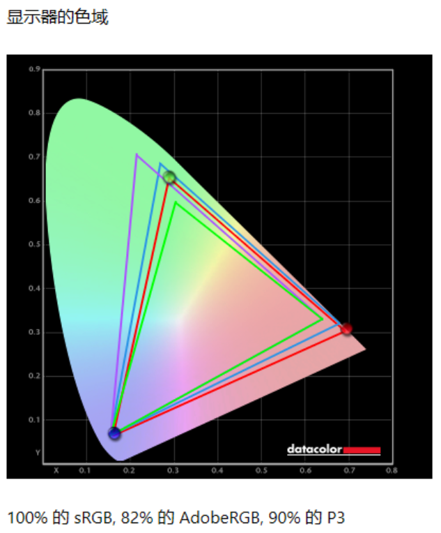 首先是色域测试,根据SpyderXElite软件的测试结果显示,AGON AG246FK显示器sRGB色域的覆盖度为100%,AdobeRGB色域的覆盖度为82%,P3色域的覆盖度为90%,表现基本符合官方宣传水平。