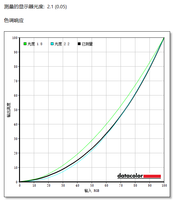 色调响应方面,已测量的黑色曲线应该尽量和浅蓝色的“光度2.2”曲线保持一致,可以看到实测的黑色曲线和“光度2.2”还有差距,色调响应表现尚可。