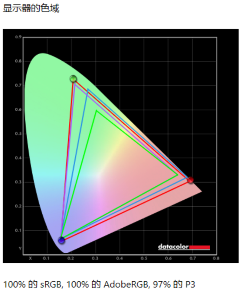 首先是色域测试,根据SpyderXElite软件的测试结果显示,HKC G27M7Pro显示器sRGB色域的覆盖度为100%,AdobeRGB色域的覆盖度为100%,P3色域的覆盖度为97%,表现符合官方宣传水平。