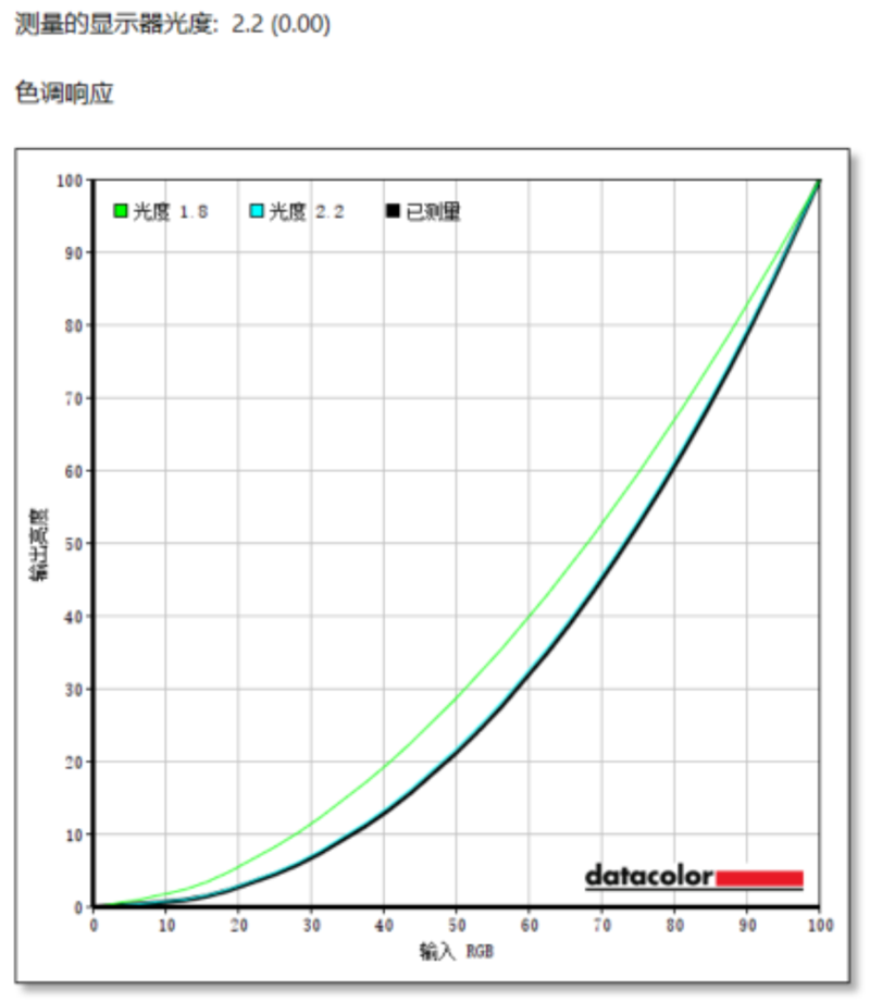 色调响应方面,已测量的黑色曲线应该尽量和浅蓝色的“光度2.2”曲线保持一致,可以看到实测的黑色曲线和“光度2.2”差距较小,色调响应表现不错。