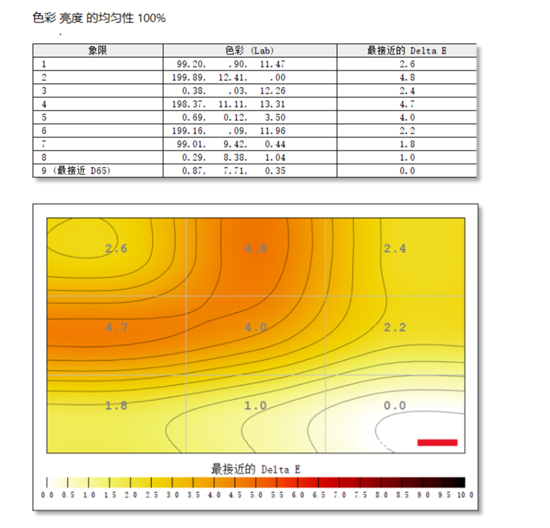在色彩均匀性的测试中,HKC G27M7Pro显示器的第9象限最接近D65的标准,显示器中间第2象限与标准色温差值最大,但也只有4.8,整体色彩均匀度表现优秀。