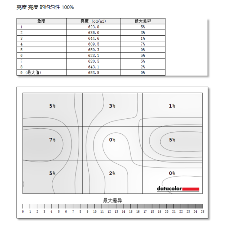 亮度均匀性的测试中,HKC G27M7Pro显示器整体表现也还不错,亮度最大为第9象限,最大差异在第4象限,差值为44cd/m²。