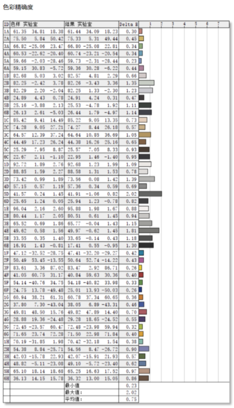 在色彩准确度的测试中,HKC G27M7Pro显示器结果为平均ΔE值为0.75,最大ΔE为2.02。一般来说平均ΔE<2,人眼就基本上分辨不出色彩的差异,HKC G27M7Pro甚至做到了平均ΔE值≤1,可以说即使面对部分专业显示器也毫不逊色。