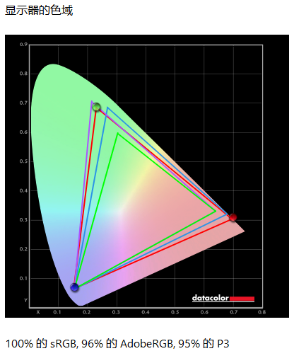 首先是色域测试,根据SpyderXElite软件的测试结果显示,HKC G27H4Pro显示器sRGB色域的覆盖度为100%,AdobeRGB色域的覆盖度为96%,P3色域的覆盖度为95%,表现符合官方宣传水平。