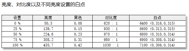 色温一致性方面,这款显示器的白点色温在6400K-7100K之间,色温随着亮度的增加变大,整体色温比较接近标准色温,屏幕最大亮度为435.7cd/m2。