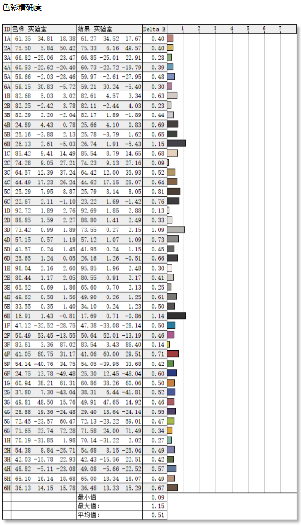 在色彩准确度的测试中,HKC G27H4Pro显示器结果为平均ΔE值为0.51,最大ΔE为1.15。一般来说平均ΔE<3,人眼就基本上分辨不出色彩的差异,HKC G27H4Pro甚至做到了平均ΔE值≤1,最大值也不超过2,可以说即使面对绝大多数专业显示器也毫不逊色。