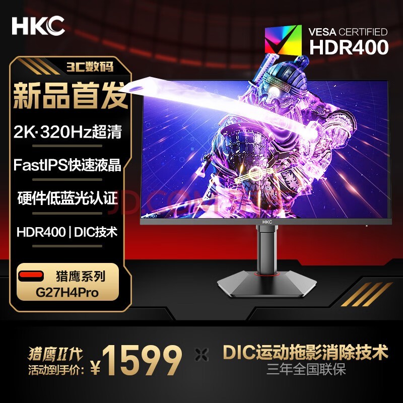 HKC 27英寸2K 320Hz FastIPS显示屏10bit硬件低蓝光HDR400电竞游戏旋转升降显示器猎二代G27H4Pro