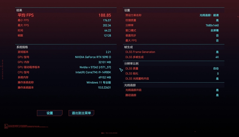 从实际体验来看,在如此高分辨率下开启DLSS 4+4X多帧生成,即便是全局光追模式下,平均游戏帧数也能达到188.85fps,游戏体验极为出色。而且AGON AG276QSD OLED电竞显示器组成的三屏画面效果绝佳,让玩家完全沉浸在赛博朋克的魔幻世界中。