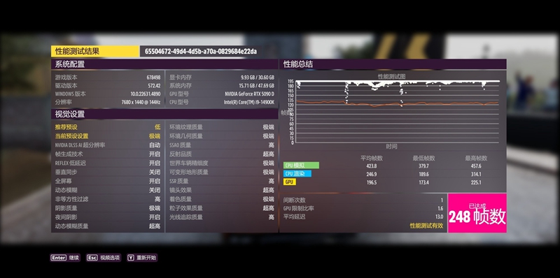 同样是在7680×1440这种超高分辨率下,即便开启极端画质,《极限竞速:地平线5》也能跑出平均248fps的流畅度,再加上三屏带来的无与伦比的真实驾驶体验,这感觉真的是太爽了!
