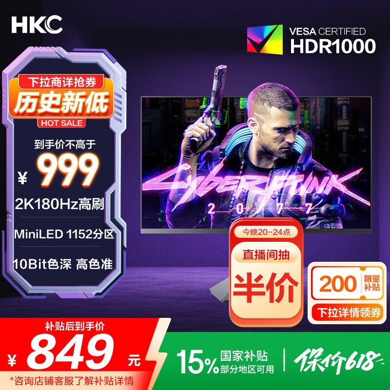 HKC G27M2 27英寸MiniLED背光1152分区QD量子点2K高清180Hz HDR1000游戏旋转升降10bit专业电竞显示器