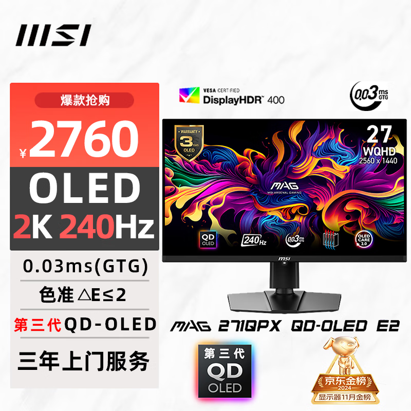 微星 MAG 271QPX E2 26.5英寸 2K 量子点 OLED 240Hz 0.03ms(GTG) HDR400 游戏电竞显示器屏