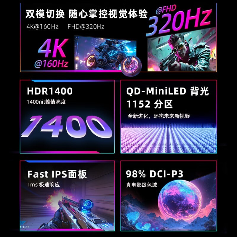 KTC M27P6 27英寸4K 160Hz双模320Hz QD量子点MiniLED显示屏 HDR1400 Type-C65W 旋转升降电竞显示器