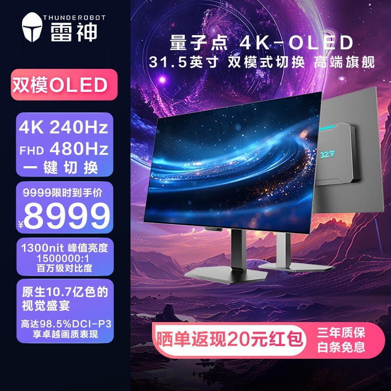 3月10日,雷神推出了一款名为“ZU32F240E”的31.5英寸显示器,并已正式开启首销。该显示器主打“4K 240Hz / FHD 480Hz双模”功能,官方定价为8999元。