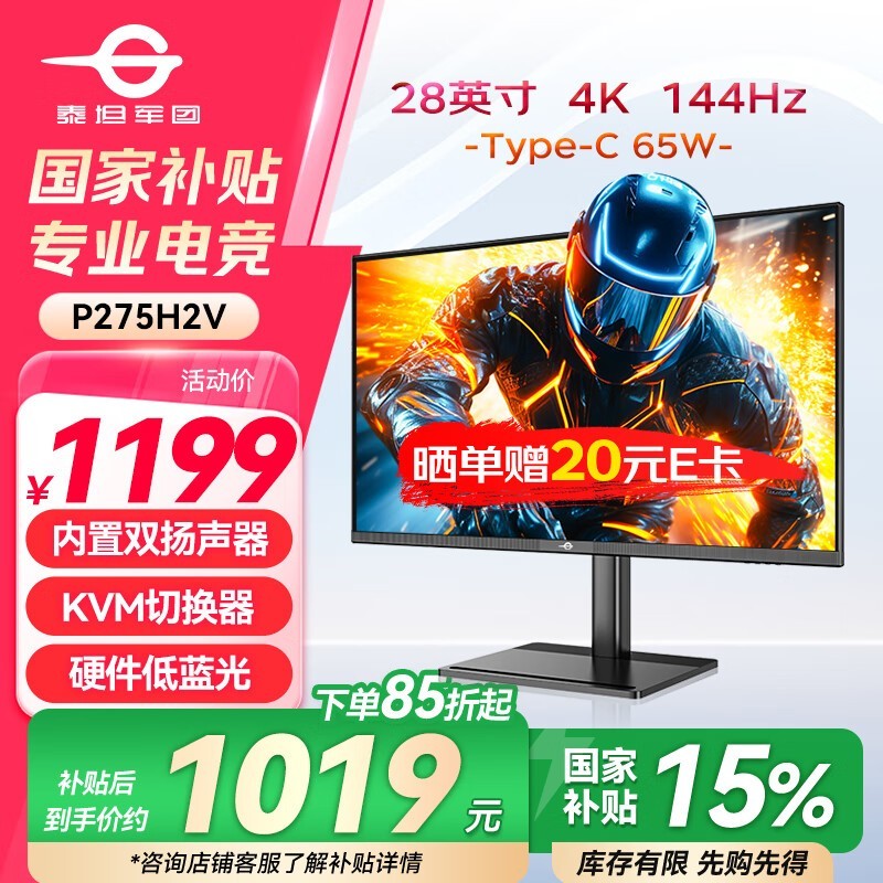 泰坦军团 P275H2V是一款28英寸的IPS电竞显示器,具备3840×2160分辨率、144Hz刷新率、95% DCI-P3广色域以及HDR10技术,能够带来卓越的画质表现和流畅的游戏体验。同时,泰坦军团 P275H2V显示器还配备了Type-C接口,支持65W反向供电,丰富的接口配置满足多种设备连接需求。无论是电竞玩家还是专业用户,都能在这块屏幕上享受到高画质与高效能的结合。目前京东活动售价仅需1399元,参与满减活动后实付低至993.21元,叠加国补15%及晒单返现20元E卡,性价比极高。泰坦军团 P275H2V显示器支持Adaptive Sync技术,减少画面撕裂,同时具备sRGB色域切换功能,配合动态显示范围更大的HDR10,无论是游戏还是观影都能呈现细腻且层次分明的画面。