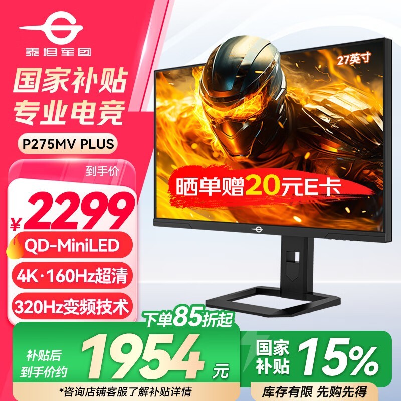 泰坦军团 P275MV PLUS显示器在京东自营的原价为2999元,下单立减700元,叠加国家补贴立减15%优惠后,到手价低至1954.15元包邮,近期是入手好价,晒单还能再赠20元E卡,有需要的朋友可以关注。