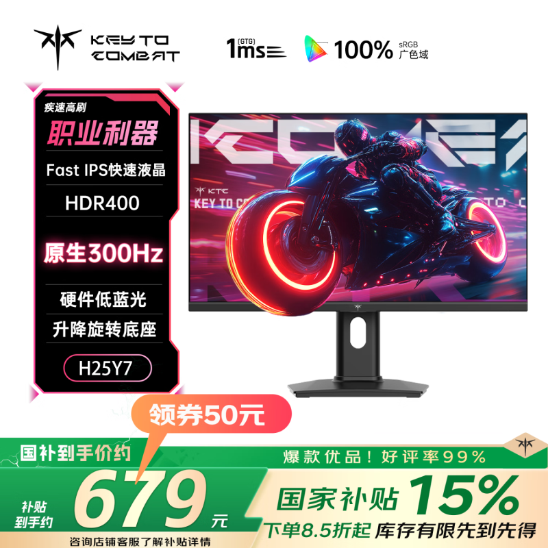 KTC H25Y7 24.5英寸 原生300Hz高刷FastIPS硬件低蓝光 电竞1ms升降旋转显示屏游戏电脑显示器国家补贴