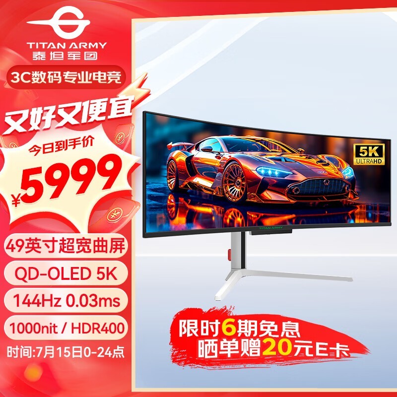 泰坦军团 G49E9R 49英寸 QD-OLED 5K曲面 HDR400超宽带鱼屏 144Hz 0.03ms 1000nit KVM 双2K分屏电竞显示器