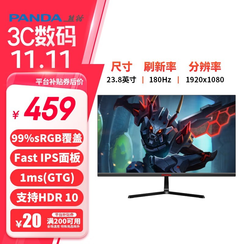 熊猫 23.8英寸显示器 180Hz高刷 FastIPS 1ms响应 111%sRGB广色域 电竞游戏小钢炮144/165升级