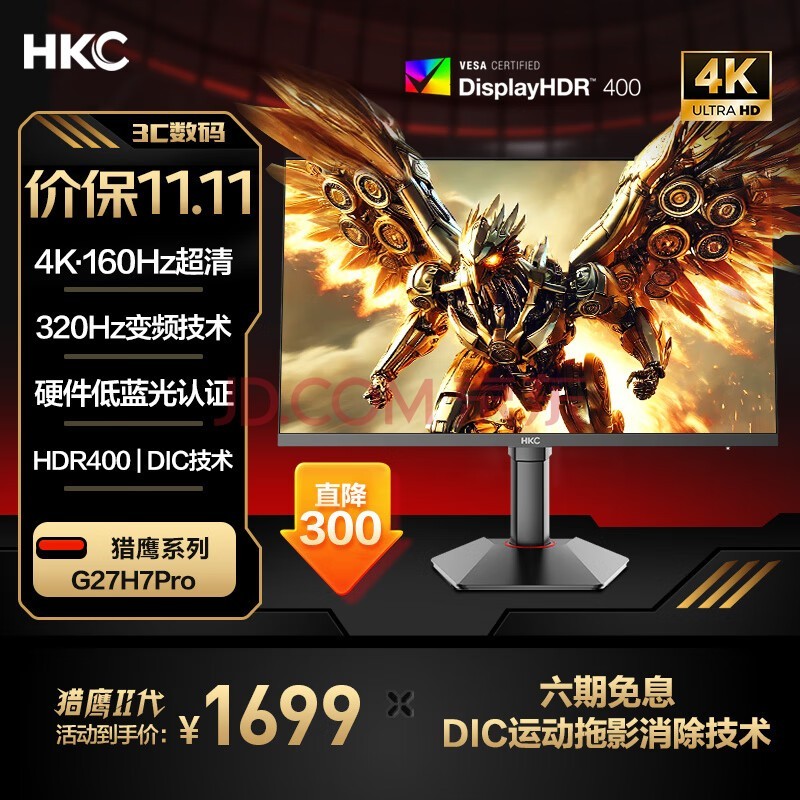 HKC G27H7Pro是一台27英寸电竞显示器,提供双模切换功能,可以在4K 160Hz和FHD 320Hz之间切换,能够适应更多不同类型的电竞游戏。HKC G27H7Pro原价1999元,双11期间叠加满减直降和平台补贴,到手价只有1699元。这样的价格对于一台双模电竞显示器来说,已经足够低了。