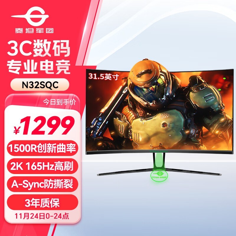 泰坦军团 N32SQ-PLUS 31.5英寸2K高清165Hz 1ms 1500R曲面屏A-Sync防撕裂 可壁挂电竞显示器 炒股票 带信仰投射灯