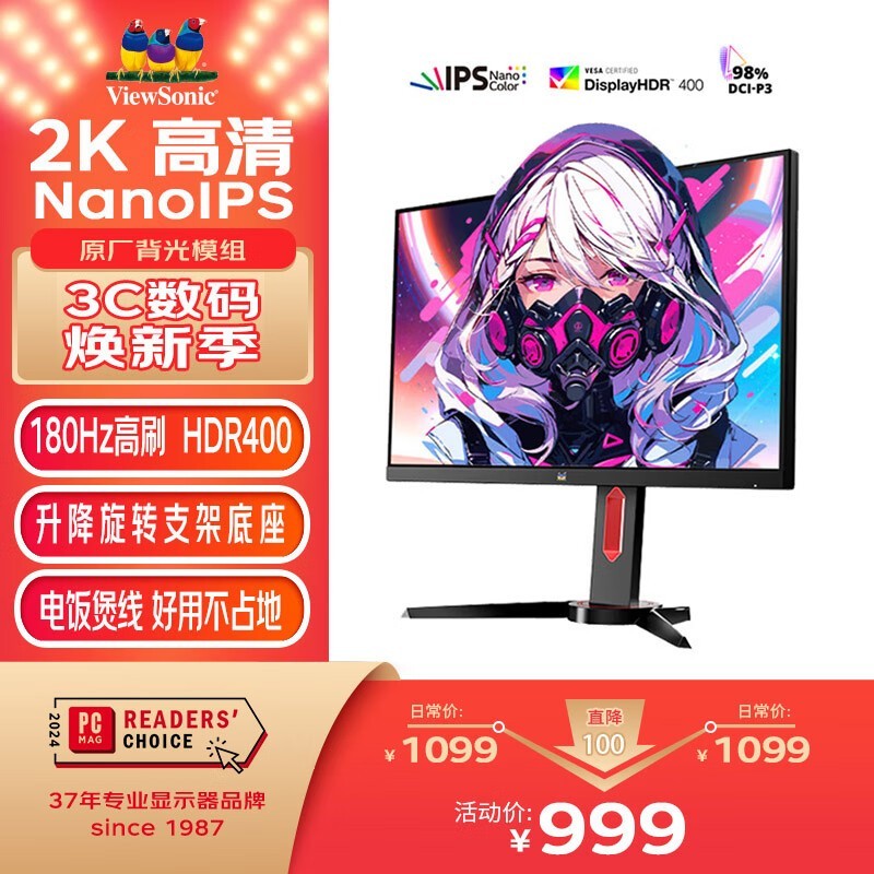 优派 VX2758-2K-PRO-8 27英寸 LGD NanoIPS 2K高清 电竞显示器 180hz超频 1ms 低蓝光 HDR400外接显示屏 旋转升降