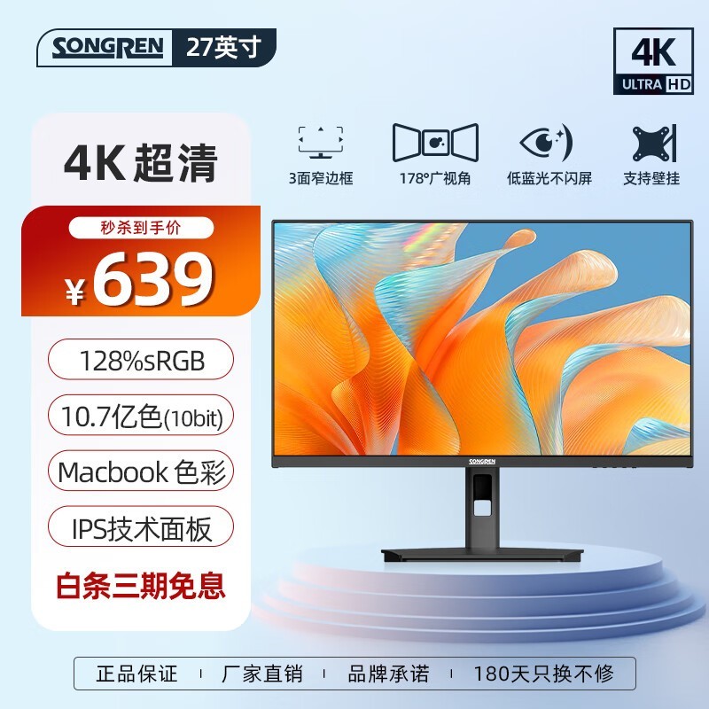 松人 T270LG 4k显示器27英寸专业办公设计IPS显示屏P3影院级色域type-c高清显示屏 27英寸/4K高清/118%色域/非升降底座