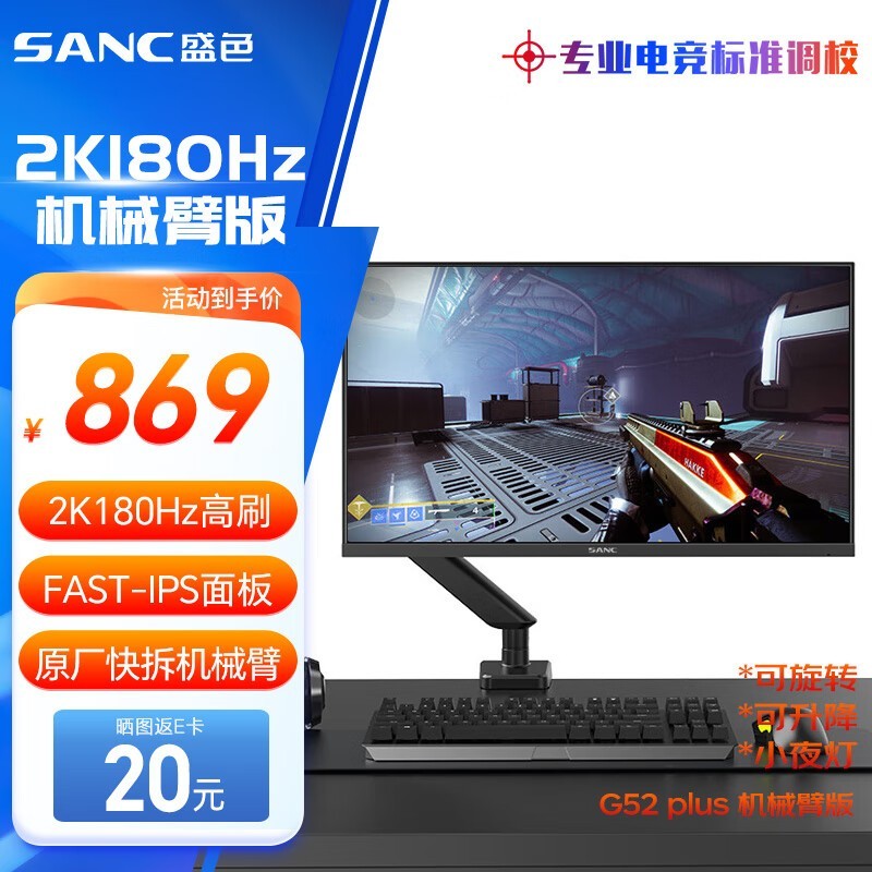 盛色 G52Plus电竞显示器,拥有23.8英寸的2K分辨率和原生180Hz的刷新率,让您无论是游戏还是工作都能得到流畅的体验。盛色 G52Plus显示器还拥有10bit的色彩深度和屏下小夜灯功能,让您的使用更加便捷舒适。现在购买还可以享受政府消费券满1件打8折的优惠活动,实付只需676元,近期好价!快来抢购吧!