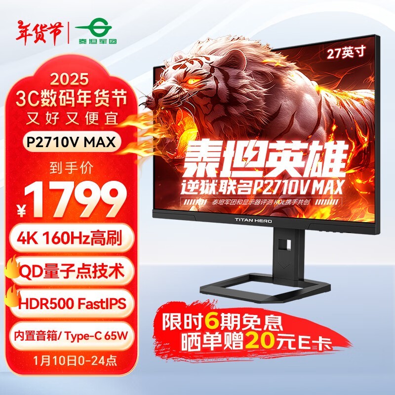 泰坦军团 P2710V 27英寸4K 160Hz QD量子点 HDR500 FastIPS 155%sRGB 内置音箱电竞显示器