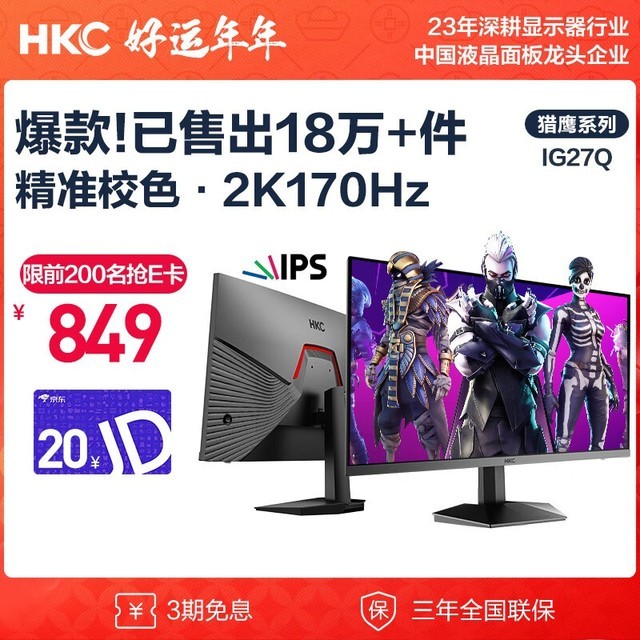 HKC IG27Q显示器还配备了HDMIII、DP信号输入接口方便, KBOX ONE、PS4、接入电视盒、游戏本等设备。购买HKC IG27Q显示器还可享受全额减价400元的优惠活动,实际支付低至849元,并可返还20元E卡。如果你正在寻找一个高清晰度、高性能的游戏显示器,那么HKC IG27Q绝对是您的最佳选择!