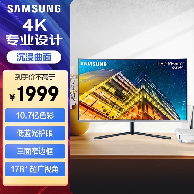 三星 U32R592 31.5英寸 4K 1500R曲面 10.7亿色 超广视角 低蓝光 高清 办公 电脑 显示器