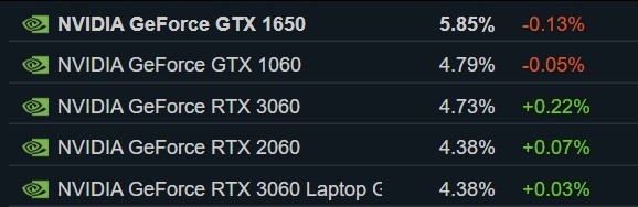 顺带一提,60级别的产品一直是最受玩家欢迎的,从Steam硬件调查榜可以看到,位列前五名的分别是GTX 1650、GTX 1060、RTX 3060、RTX2060,以及RTX 3060 Laptop。