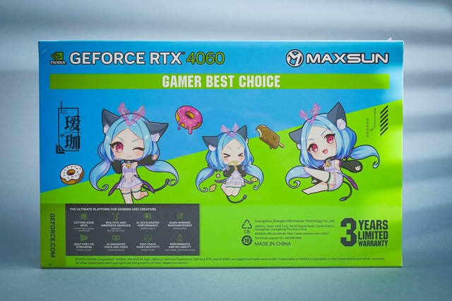 在RTX 4070等三风扇显卡中,瑷珈系列的包装均采用竖置设计,而且IP形象为成熟的“大瑷珈”。在这张RTX4060双风扇小卡上,IP形象也换成了更可爱的Q版“小瑷珈”。