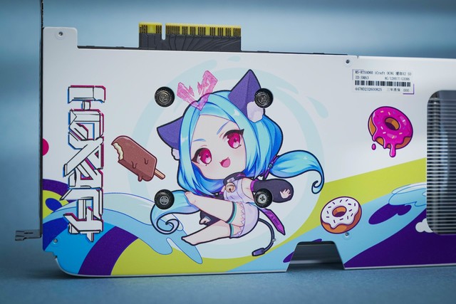 双风扇的尺寸大小刚好适合这种圆墩墩的显卡,搭配背板的糖果配色,让这张甜品卡甜到�。如果你打算装一套白色系,可爱主题的电脑,那么这张小瑷珈显卡绝对是第一“人选”。