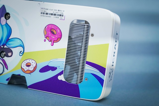 铭瑄 RTX4060 iCraft OC8G 瑷珈X2采用了一体式合金背板,可有效加固显卡,防止变形延长寿命。除了尺寸有所区别外,背板设计也是双风扇与三风扇最大的区别,不同于三风扇瑷珈的性感妩媚,双风扇Q版瑷珈搭配鲜艳多彩的糖果色,以“萌”为主基调。